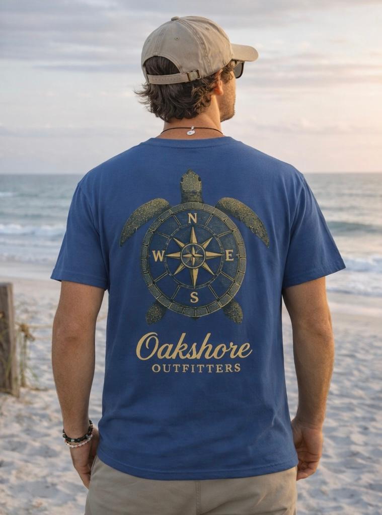 Inspired by open water and timeless direction, the Compass Turtle Tee is made for those who feel most at home near the shore. Faeturing our signature Compass Turtle design on the back and a subtle Oakshore Outfitters mark on the chest, this tee blends laid-back coastal style with quiet detail.